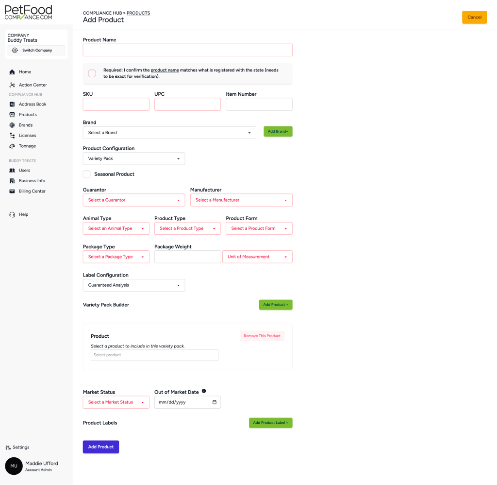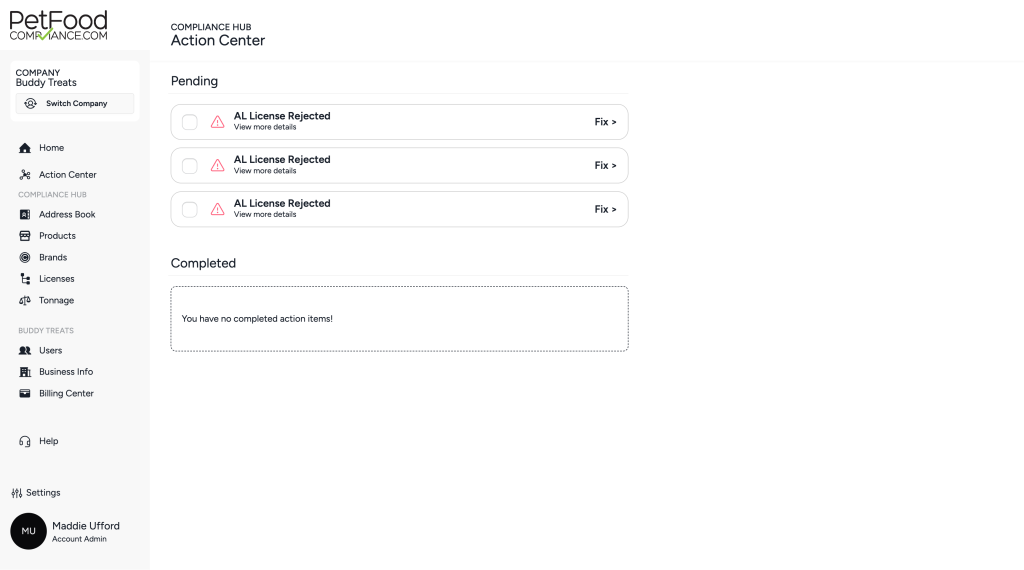 At its core, the Compliance Hub is a centralized system that helps pet food companies manage licenses, products, formulations, and retailer-facing compliance requirements in one place. It’s how we keep registrations organized, documentation accurate, and retailers confident that what they’re receiving is complete and current.